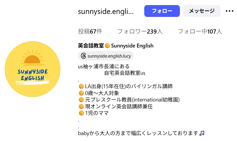 ホームページURL | https://www.instagram.com/sunnyside.english.lucy?igshid=YmMyMTA2M2Y%3D |